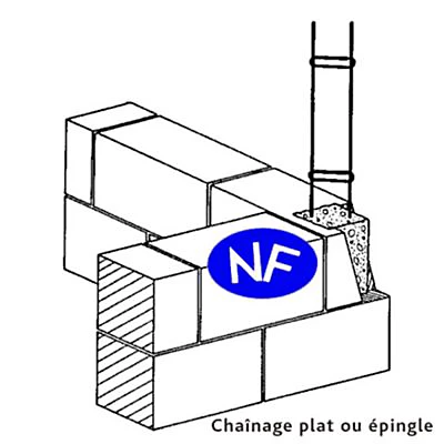 Ces chaînages plats ou “épingle” assurent la liaison entre les différents éléments d’un bâtiment qu’ils solidarisent avec les planchers et les fondations. Ils s’utilisent entre autres dans les rampants