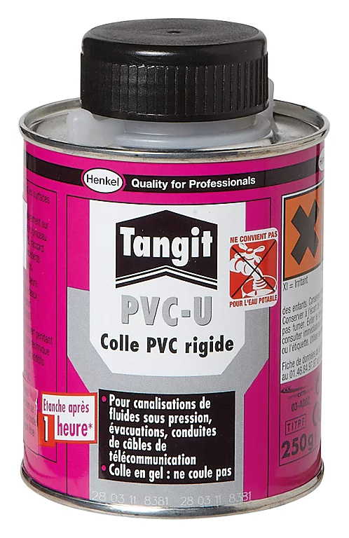 Conseil d’utilisation : Afin d’éviter toute évaporation excessive de produits volatiles, veiller entre chaque usage de la colle Tangit à bien refermer le récipient qui les contient. La mise en oeuvre doit obligatoirement être effectuée en un lieu protégé de la pluie. D’autre part, il est indispensable de veiller à ce que le bidon ouvert ne puisse recevoir des projections (pluie ou autre), ce qui détruirait l’adhésif restant dans le bidon. De même, il est indispensable de veiller à ce que les éléments à assembler ainsi que le pinceau ne soient pas mouillés lors de l’application de la colle. Restrictions d’usage : Colle pour l’assemblage d’éléments en PVC-U (PVC rigide). Normes : Avis technique n° 15/98-244 et 15/98-246 CSTB 03-244 Mentions Legales : Dangereux – Respecter les précautions d’emploi