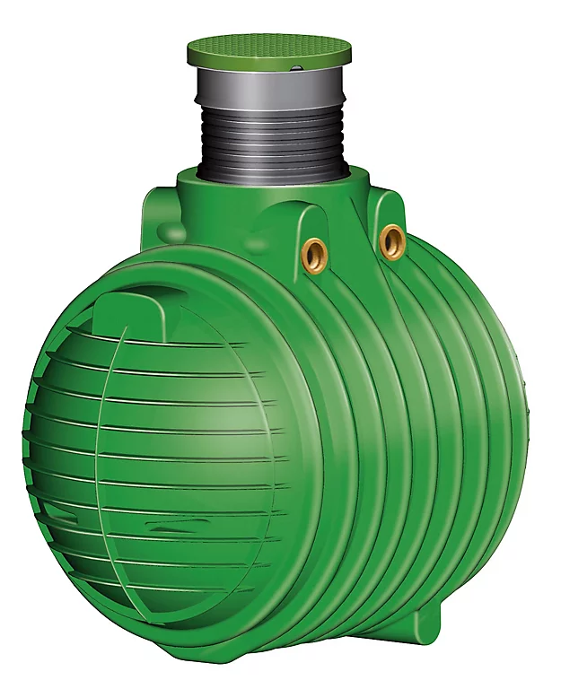 Cuve COLUMBUS 3700 L vert à enterrer – 100% recyclable et fabriquée en grande partie à partir de matières recyclées. Cuve monobloc sans soudure (ouverture dôme Ø 60 cm) équipée de 4 joints à lèvres DN 100/110. Rehausse télescopique Columbus (inclinable et ajustable en hauteur de 22 à 70cm, Ø 60 cm). Couvercle PE double parois couleur vert (Ø 70cm) avec sécurité enfants. Passage piétons jusqu’à 150 kg.