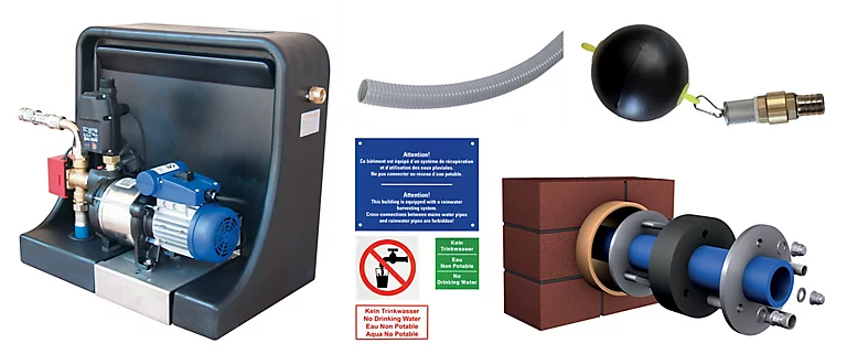 | Fourni avec | Station de pilotage eau de pluie/eau du réseau prémontée, équipée d’une pompe électrique multicellulaire. Cette station de pilotage permet en toute sécurité (disconnexion interne) de basculer automatiquement sur le réseau s’il n’y a plus d’eau dans la cuve Set de tirage composé d’une crépine avec clapet anti-retour et d’un flotteur tuyau de tirage Passe mur DN 100 Set de marquage eau non potable |